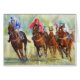 The leading horses round the bend in a thrilling National Hunt race, hooves pounding on the mud.
