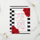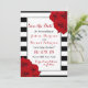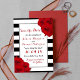 The chic modern luxe wedding collection features a classic black and white stripe background accentuated with beautiful ruby red roses and a faux silver foil frame.