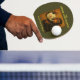 The world famous and totally imaginary Chimp and Teapot pub in Wick, Scotland. A chimpanzee holding a teapot with a floral pattern as if about to drink from the spout. Text at the top reads, "THE CHIMP AND TEAPOT" Customise by adding your own additional text.