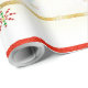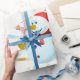 This design features a white and blue snowflake, a golden tree, coloured snowflakes and lots of snowmen dressed for a cold Christmas season. A red border was added. This Christmas wrapping paper is available in assorted styles, colours and sizes.