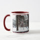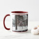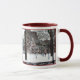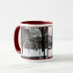 A beautiful Christmas tree decorates the middle of a field during a snowfall on this festive holiday mug.