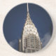 An iconic image of the top of the Chrysler Building which is one of the most famous skyscrapers in New York City. The sun illuminates the architectural details of the top of this skyscraper.
