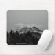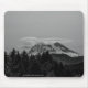 A black and white photograph of Mount Rainier. In the foreground are rows of trees, and at the base of Rainier are hills. The snow covered volcano has a large, interestingly shaped cloud behind it. To some it looks like an antique rendering of a space ship, to others it's a human shape. What does the cloud look like to you? Image Copyright ©2023 Kimberly J Tilley. zazzle.com/store/developingnature