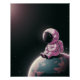 A lone astronaut in a soft pink suit stands in serene silence on an unfamiliar planet. The ground beneath glows with dusty rose tones, while a wide sky stretches above, filled with drifting clouds and hints of distant stars. There's no noise — only stillness, reflection, and awe. “The Quiet Explorer” captures a moment of quiet courage and wonder, symbolising the beauty of stepping into the unknown with grace and curiosity.
