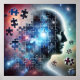 A surreal and symbolic artwork portraying a human figure dissolving into puzzle pieces against a cosmic backdrop. The missing pieces reveal a luminous universe within, symbolising the search for identity, self-discovery, and the infinite complexity of the human mind. This dreamlike composition evokes themes of existential exploration, the interconnectedness of thought, and the journey to find meaning within the vastness of the universe.