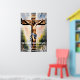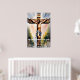Jesus with long wavy hair and a beard, looking upwards with a contemplative expression. He has a wound on his forehead, and there's a red mark resembling a cross on his skin. He is wearing a white cloth draped over his shoulders, and a chain necklace is visible around his neck. The background showcases a wooden cross with red ropes, and the sky above is cloudy.