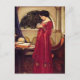 "The Crystal Ball" by John William Waterhouse, 1902, shows a young woman in a red dress gazing into a crystal ball, apparently weaving a spell with the aid of a book and a skull.