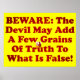 BEWARE: THE DEVIL MAY ADD A FEW GRAINS OF TRUTH TO WHAT IS FALSE! - John gave three marks of false teachers who are controlled by the spirit of the antichrists: They depart from the fellowship, they deny Jesus as the Messiah, and they draw the faithful away from Jesus. He encouraged believers to protect themselves against the spirit of the antichrists by depending on the indwelling presence of the Spirit, knowing the truth, and remaining in fellowship with Jesus. We can protect ourselves from error and deception by knowing the false but relying on the Truth, Jesus Christ. The devil may add a few grains of truth to what is false. Order your poster with this beautiful spiritual image on it today!