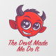 Vector cartoon illustration of a devilishly cute little devil with big eyes with The Devil Made Me Do It text. Keywords: devil, hell, cute, demon, evil, satan, halloween, monster, horns, horror, adorable, sweet, devilishly, devilish, precious, endearing, loveable, lovely, appealing, engaging, delightful, dear, darling, winning, winsome, charming, enchanting, attractive, pretty, adorbs