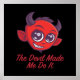 Vector cartoon illustration of a devilishly cute little devil with big eyes with The Devil Made Me Do It text. Keywords: devil, hell, cute, demon, evil, satan, halloween, monster, horns, horror, adorable, sweet, devilishly, devilish, precious, endearing, loveable, lovely, appealing, engaging, delightful, dear, darling, winning, winsome, charming, enchanting, attractive, pretty, adorbs