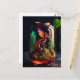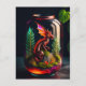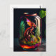 Enchanted postcard features a glass terrarium with a tiny dragon seated among nature elements. Digital art painting created using AI generating software.