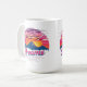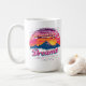 This design captures a vibrant, retro-inspired sunset scene. A stylised sun, with a striking gradient from deep purple to fiery orange, sets behind a detailed mountain range. The mountains are rendered in deep blues and blacks, with a line of dark pine trees at their base. The text "Chasing" and "Dreams" frames the image in a bold, retro font with a bright pink and blue colour scheme, evoking a sense of adventure and optimism. It's a perfect blend of natural beauty and a retro aesthetic, ideal for those who love travel, nature, and vintage art styles.