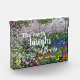 Acrylic photo block for display that features the photo image of a colourful, summer garden of flowers that include Zinnias, pink Nicotiana, and Blue Salvia along with a popular quote by essayist Ralph Waldo Emerson that reads, "The earth laughs in flowers" and printed in white, stylised text. A lovely, floral design!