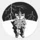 A man sitting in an electric chair, reading a newspaper, in a lightning storm, waiting. Black & white and orange & white graphic, on t-shirts, hoodies, cards, gifts.