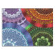 Water, fire, earth, and wind themed concentric circle mandalas come together in this colourful design. Each features a similar centre and outer layer with the others being appropriate to the element.