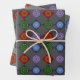 Water, fire, earth, and wind themed concentric circle mandalas come together in this colourful design. Each features a similar centre and outer layer with the others being appropriate to the element. Two sheets in this set feature the mandalas on complimentary coloured diamonds patterned across a dark grey background, while the third sheet features a pattern of mandalas scattered on a lighter grey background to give you options and variety for your gift wrapping or DIY projects.