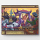 The Emperor’s New Clothes Original Fairy Tale Art painted by our talented children’s illustrator, Traci Van Wagoner, shows the Emperor parading through town in all his new suit glory (with a curtain strategically covering his private parts) in his carriage being pulled by two beautiful horses, one black and one white. A man and his son and dog watch from outside the decorative frame with the boy pointing out that the Emperor has nothing on at all. Anyone who loves fantasy and fairy tales will love this artwork.