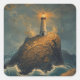 A radiant lighthouse stands atop a carved cliff, its golden light piercing stormy skies and crashing waves.