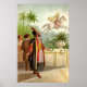 vintage painting of a tale in the arabian nights stories of the 'the enchanted horse' with the king dressed in regal clothing and hat, with two men standing on a lovely balcony with pot plants, palm trees in the distance and a man with a yellow turban and pink clothes riding a beautiful and majestic white horse in the sky. vintage watercolor watercolour illustration of a tale from scheherazade 1001 nights with the king in decorative and ornate red, yellow, and black cloak and coat and two males standing on a white palace balcony watching a horse and rider flying away into the distance.