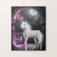 A majestic white unicorn stands gracefully on a stone platform framed by tall, gothic arches. Her mane flows gently, glowing faintly in the moonlight, while a soft halo of mist and magic curls around her. The unicorn’s horn shines with an ethereal light, casting a gentle glow across the dark, enchanted setting.