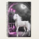 A majestic white unicorn stands gracefully on a stone platform framed by tall, gothic arches. Her mane flows gently, glowing faintly in the moonlight, while a soft halo of mist and magic curls around her. The unicorn’s horn shines with an ethereal light, casting a gentle glow across the dark, enchanted setting.