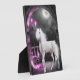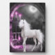 A majestic white unicorn stands gracefully on a stone platform framed by tall, gothic arches. Her mane flows gently, glowing faintly in the moonlight, while a soft halo of mist and magic curls around her. The unicorn’s horn shines with an ethereal light, casting a gentle glow across the dark, enchanted setting.