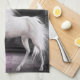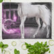 A majestic white unicorn stands gracefully on a stone platform framed by tall, gothic arches. Her mane flows gently, glowing faintly in the moonlight, while a soft halo of mist and magic curls around her. The unicorn’s horn shines with an ethereal light, casting a gentle glow across the dark, enchanted setting.