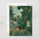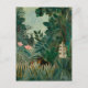 The Equatorial Jungle (1909) by French post-impressionist artist Henri Rousseau. Rousseau derived his many jungle scenes from reading travel books and visiting the Paris botanical garden. He was a self-taught artist and is considered to be a naïve or primitive painter. His work had an extensive influence on several generations of avant-garde artists.