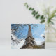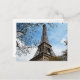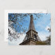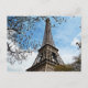 This photo captures the iconic Eiffel tower in Paris. The postcard features the tower with surrounding trees and clear blue skies about the tower.