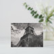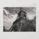 Another view of the iconic eiffel tower beautifully framed in this black and white postcard. Silhouetted againist a digitally enhanced cloudy sky and surrounded by trees.