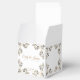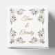 Images of fancy Golden leaf borders encompass all sides of this White fold top square box-shaped favour box. Has the newlyweds personalised names on the front in Golden along with the wedding date and temple name at bottom. Top has phrase of "Time & Eternity" inside the borders. Sample names and date shown. Customise this item if desired.