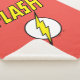 Check out this iconic logo for The Flash, featuring his name in telescopic speed style over the bright yellow lightning bolt in circle icon!