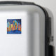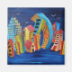 A colourful, fun, quirky painting using blues, red, yellow and orange colours and depicting bent buildings floating on water. This painting would be great as a focal point in any house.