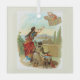 vintage painting illustration for a fairy tale by hans christian anderson with the sultan's daughter in vintage turkish clothing, long brown hair and bracelets is next to her servant who is preparing a meal, are at the top of a tower where the lady is waving at a man in the sky who is inside a flying trunk waving to her and dressed in orange dress.