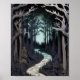 A winding river flows through a dense, dark forest with tall, barren trees. The scene is composed of intricately layered paper cutouts, giving it a three-dimensional effect.