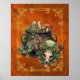 Beautiful Wiccan inspired digital art poster features AI generated forest cauldron with decorated skull and moth on an antique book background.