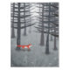 A wild red fox stands among trees in a dark forest. A landscape painting for animal, nature and wildlife lovers.
