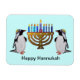 Graphic illustration of penguins celebrating the holiday of Chanukah by the lights of the menorah. Great gift idea for one of the eight nights!
