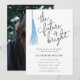 Modern graduation party invitation template card featuring hand lettered typography script that says "the future is bright." There is an illustration of a light blue tassel next to it. You can add the graduate's photo on the back of the card. Great for both high school and college graduate.