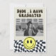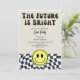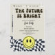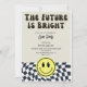 Modern retro vintage fun graduation party invitation template card featuring hand lettered typography script that says "the future is bright." There is a back and white chequered pattern at the bottom along with a happy face. You can add the graduate's photo on the back of the card.