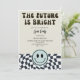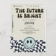 Modern retro vintage fun graduation party invitation template card featuring hand lettered typography script that says "the future is bright." There is a back and white chequered pattern at the bottom along with a happy face. You can add the graduate's photo on the back of the card.