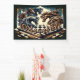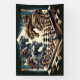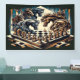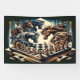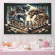 The design depicts a fascinating and imaginative chess scene in which horses with impressive manes and detailed armour are gathered over a chess board. The horses appear to be strategically involved in the game of chess, creating a strong symbolic connection to the knight in the game of chess. The style is a mix of vintage engraving and modern illustration with dynamic lines and dramatic colouring in shades of blue, gold and brown. The design conveys a mystical and strategic atmosphere, perfect for chess lovers and fantasy enthusiasts.