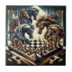 The design depicts a fascinating and imaginative chess scene in which horses with impressive manes and detailed armour are gathered over a chess board. The horses appear to be strategically involved in the game of chess, creating a strong symbolic connection to the knight in the game of chess. The style is a mix of vintage engraving and modern illustration with dynamic lines and dramatic colouring in shades of blue, gold and brown. The design conveys a mystical and strategic atmosphere, perfect for chess lovers and fantasy enthusiasts.