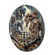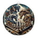 The design depicts a fascinating and imaginative chess scene in which horses with impressive manes and detailed armour are gathered over a chess board. The horses appear to be strategically involved in the game of chess, creating a strong symbolic connection to the knight in the game of chess. The style is a mix of vintage engraving and modern illustration with dynamic lines and dramatic colouring in shades of blue, gold and brown. The design conveys a mystical and strategic atmosphere, perfect for chess lovers and fantasy enthusiasts.