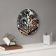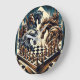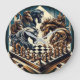 The design depicts a fascinating and imaginative chess scene in which horses with impressive manes and detailed armour are gathered over a chess board. The horses appear to be strategically involved in the game of chess, creating a strong symbolic connection to the knight in the game of chess. The style is a mix of vintage engraving and modern illustration with dynamic lines and dramatic colouring in shades of blue, gold and brown. The design conveys a mystical and strategic atmosphere, perfect for chess lovers and fantasy enthusiasts.