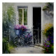 A bicycle stands near the door of a house in a summer garden. The bike is a simple, model with a basket on the front. The basket is filled with flowers, which are in full bloom. They create a beautiful and colourful display.