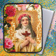 Saint Rose of Lima is surrounded by an arrangement of beautiful, colourful flowers and ornate scroll work. A background of yellow brocade compliments the elaborate illustration collage.
