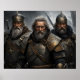 Three stern-looking, bearded men in ornate medieval armor stand side by side, each gazing intently towards the viewer. They wear helmets adorned with intricate designs, and their armor is embellished with golden accents, signifying their high rank or valor.