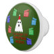 This awesome ceramic knob features a cute Christmas ghost with black eyes and mouth wide open. The ghost is wearing a festive red and white hat with a pompom on the top. There are sparkly red, blue and green presents surrounding the ghost. A message in festive red text below the ghost says "The Ghost of Christmas Presents" in bold capital letters. This funny festive design is suitable for all ages.