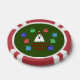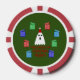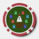 This awesome set of poker chips features a cute Christmas ghost with black eyes and mouth wide open. The ghost is wearing a festive red and white hat with a pompom on the top. There are sparkly red, blue and green presents surrounding the ghost. A message in festive red text below the ghost says "The Ghost of Christmas Presents" in bold capital letters. This funny festive design is suitable for all ages.
